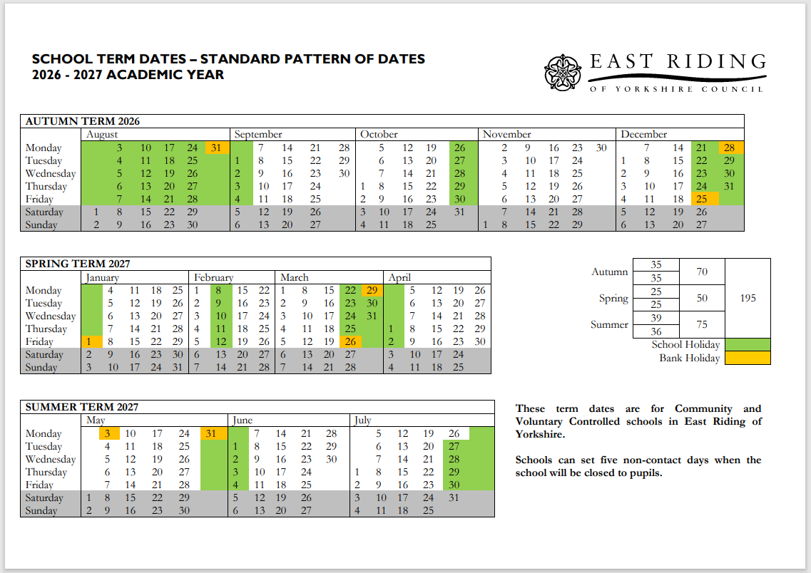 Please note that the INSET days have not been added to the calendar below.